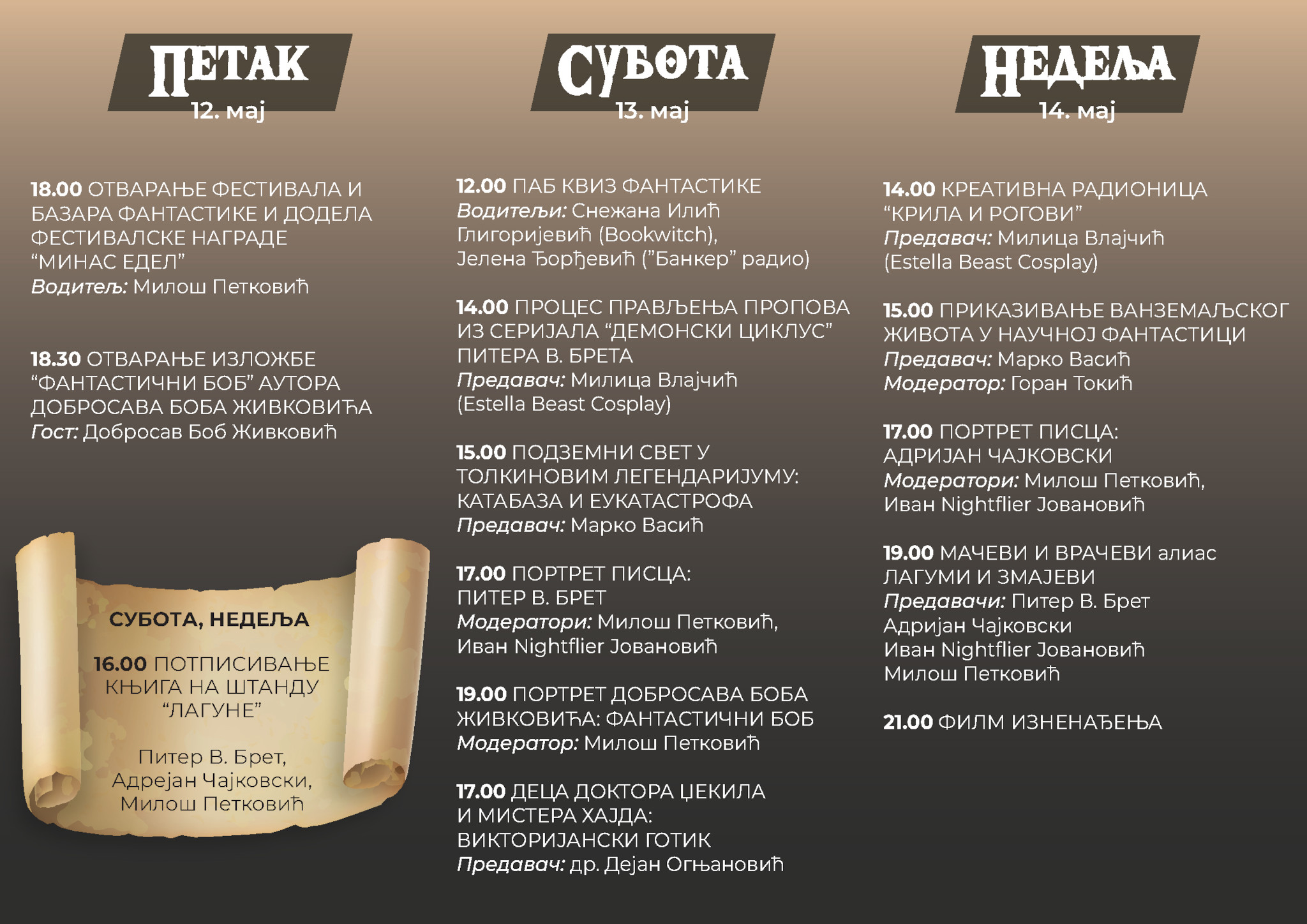 Među predavačima će se naći i tolkinist Marko Vasić, Vlada Gašić i dr Dejan Ognjanović koji će pokriti teme Tolkinovog opusa, naučne fantastike i viktorijanskog horora, dok će se Milica Vlajčić pozabaviti temom cosplay-a i kreativnom radionicom. Program će upotpuniti dodela festivalskih nagrada “Minas Edel” za doprinos fantastici, filmovi iznenađenja, PAB kviz, Bazar fantastike i kutak društvenih igara. Festival će, tradicionalno, otvoriti niški pisac Miloš Petković, umetnički direktor Festivala”, najavljuju