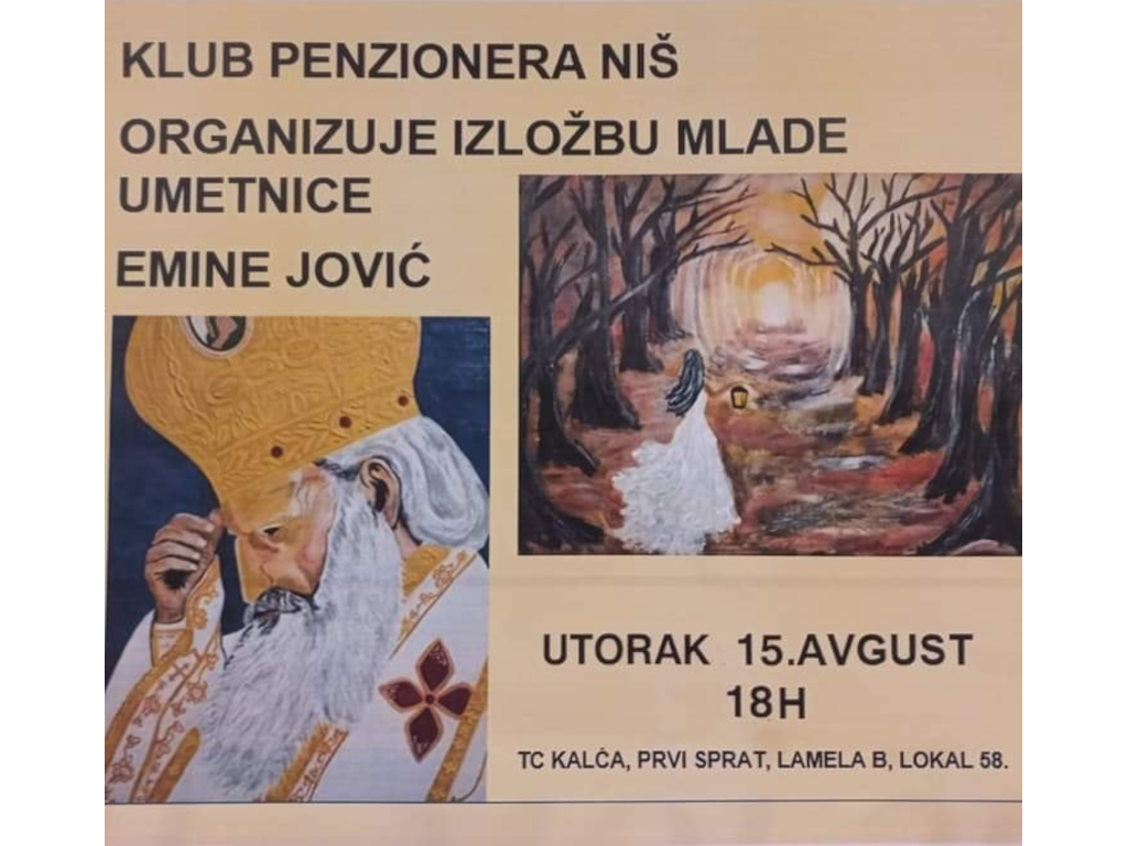 Klub penzionera Niša u utorak 15.8.2023., sa početkom u 18h, organizuje izložbu slika Emine Jović, mlade likovne umetnice, članice udruženja LUNA.