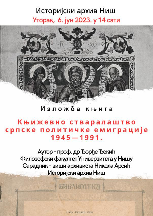 Izložba prati razvoj književnog stvaralaštva srpske političke emigracije koja je morala da napusti Jugoslaviju posle završetka Drugog svetskog rata i uspostavljanje socijalističke vlasti.