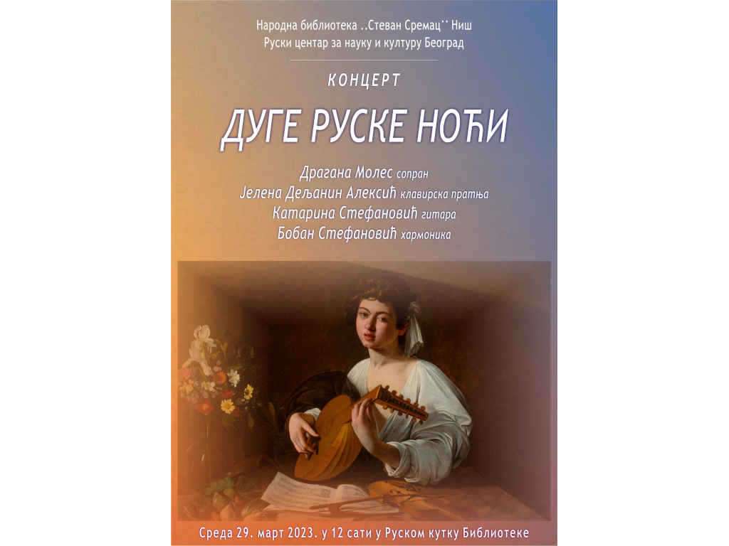 U sredu 29. marta 2023. godine, Narodna biblioteka „Stevan Sremac" Niš u saradnji sa Ruskim centrom za nauku i kulturu Beograd, priređuje koncert pod nazivom „Duge ruske noći".