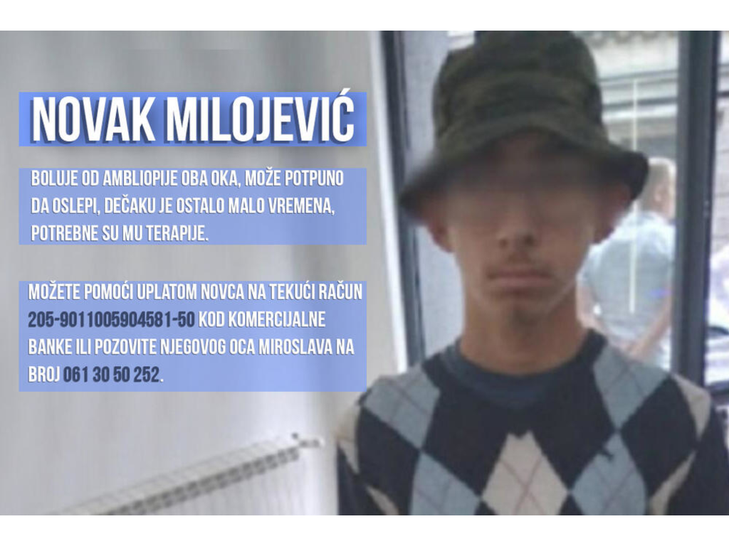 Novak je slabovid, skoro 80 odsto. Potrebno mu je redovno lečenje na jednoj privatoj klinici u Novom Sadu.