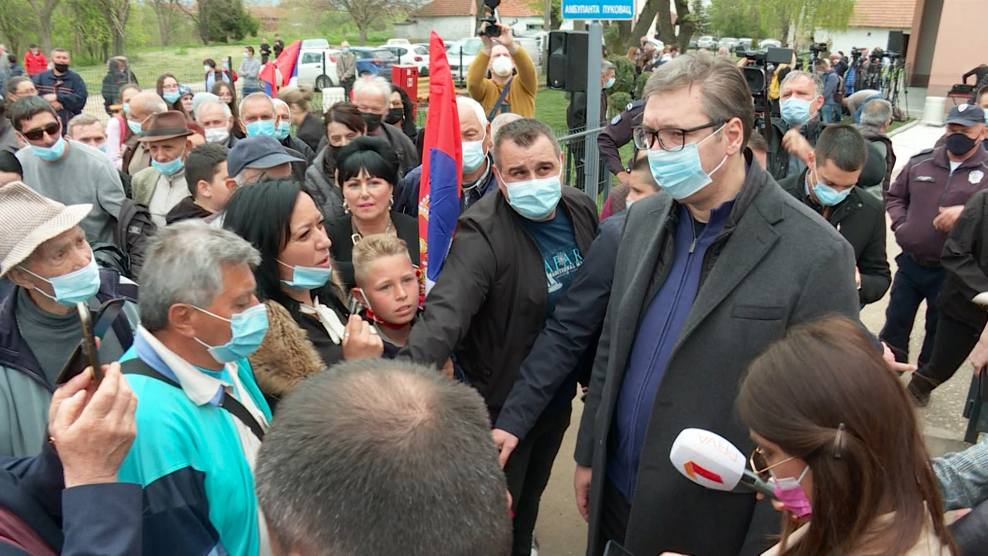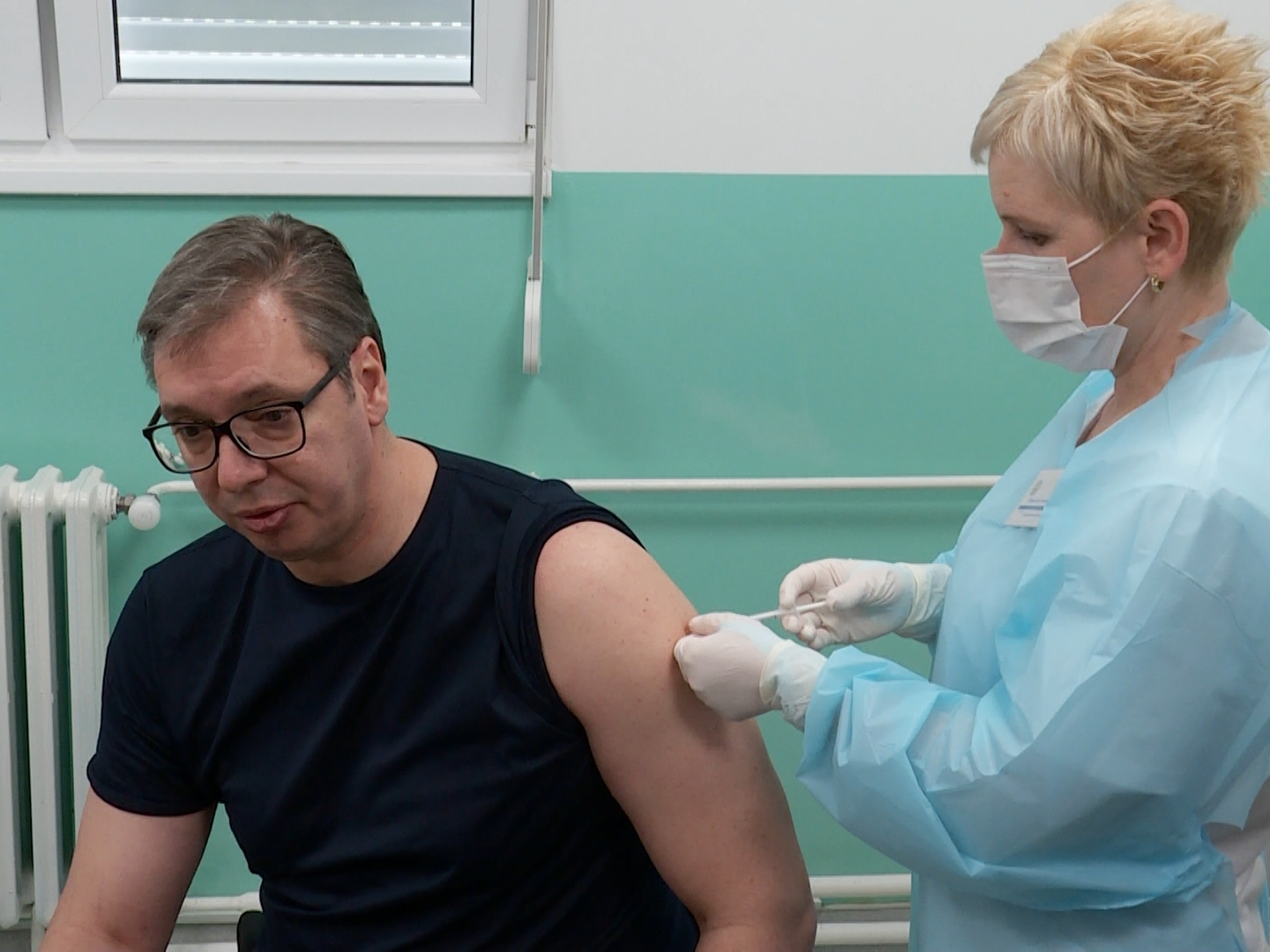 Predsednik Srbije Aleksandar Vučić primio je danas u podne drugu dozu kineske Sinofarm vakcine u zdravstvenoj stanici u Pukovcu, a nakon toga je i razgovarao meštanima.