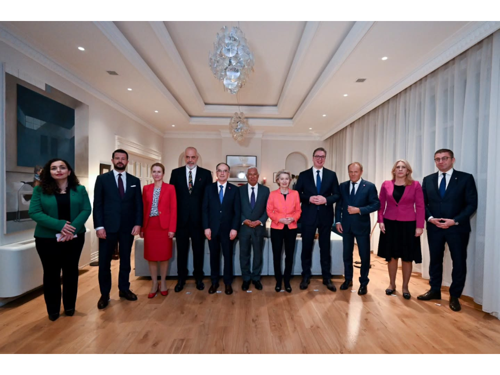 Vučić je objavio i fotografiju pred neformalnu večeru koju je za učesnike Samita iz regiona Zapadnog Balkana priredio predsednik Evropskog saveta Antonio Košta sa zvaničnicima Evropske unije, predsednicom Evropske komisije Ursulom fon der Lajen i visokom predstavnicom EU za spoljnu politiku i bezbednost i potpredsednicom Evropske komisije Kajom Kalas.