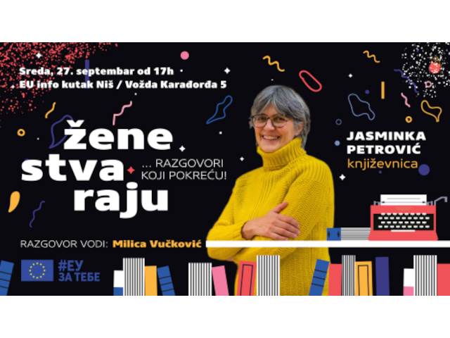 “Ideja ciklusa ‘Žene stvaraju – priče koje pokreću’ koji smo pokrenuli je da zajedno sa istaknutim književnicama i stvaraocima govorimo o stvaralaštvu i poetici, ali i o položaju žene i ženskom identitetu u našem društvu. U prethodnom periodu ugostili smo naše sjajne pesnikinje Vitomirku Trebovac, Maju Solar, Draganu Mladenović i Ognjeku Lakićević”, saopšteno je iz EU info kutka Niš.
